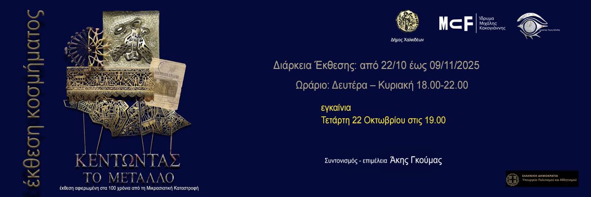 Η Πρόεδρος του Εργαστηρίου Τέχνης Χαλκίδας κυρία Χαρίκλεια Μυταρά και η Διευθύντρια του Ιδρύματος «Μιχάλης Κακογιάννης» κυρία Ξένια Καλδάρα, σας προσκαλούν στα εγκαίνια της Έκθεσης του τμήματος Κοσμήματος του Εργαστηρίου Τέχνης, η οποία είναι αφιερωμένη στα 100 χρόνια από την Μικρασιατική Καταστροφή, την Τετάρτη 22 Οκτωβρίου στις 19.00, στο Ίδρυμα «Μιχάλης Κακογιάννης».