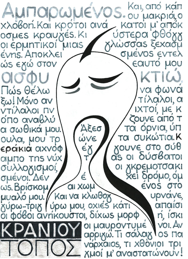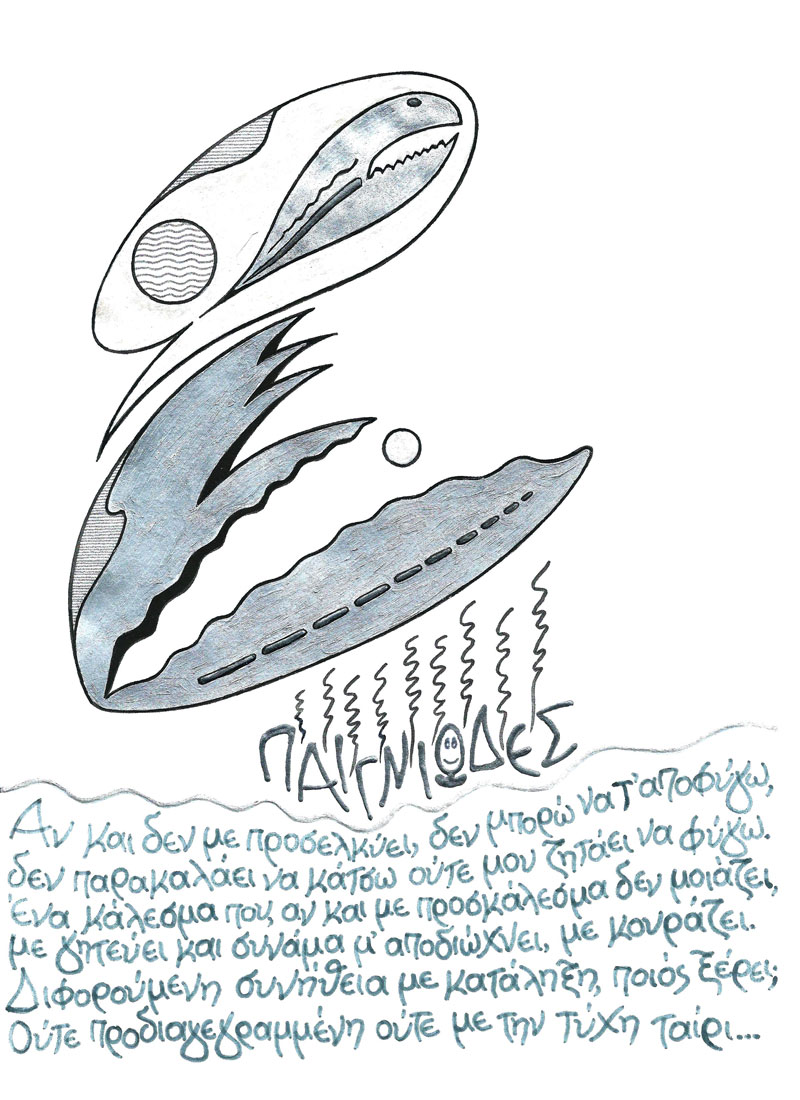 η συνύπαρξη της εικόνας και του λόγου. ʼλλες φορές τα ποιήματα προϋπήρχαν των σχεδίων, άλλοτε προηγήθηκαν τα σχέδια και τα ποιήματα ήρθαν να «κουμπώσουν», να δεθούν μαζί τους. Πάντως, εκτός από μια-δυο περιπτώσεις, δεν έγιναν οι ζωγραφιές «επί τούτου», κείμενα και σχέδια υπήρχαν ανεξάρτητα και περίμεναν να βρεθεί εκείνο το αόρατο νήμα που θα τα συνέδεε μ έναν τρόπο μυστικό και μυστήριο κι ωστόσο, εν τέλει, φυσικό και αναγκαίο.