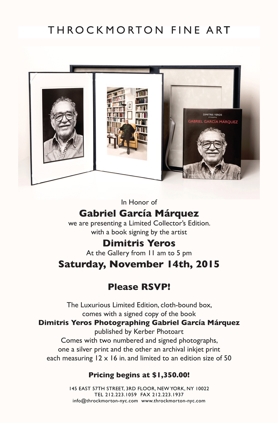 Η γκαλερί Throckmorton Fine Art της Νέας Υόρκης (145 east, 57 str, 3rd floor. Phone: 212 223 1059) παρουσιάζει στις 14 Νοεμβρίου τη συλλεκτική έκδοση του Δημήτρη Γέρου Photographing Gabriel Garcia Marquez και τις φωτογραφίες που έκανε κατά τις συναντήσεις του με τον φίλο του κολομβιανό συγγραφέα και οι οποίες κυκλοφόρησαν τον περασμένο Απρίλιο, σε πολυσέλιδο τόμο από τις γερμανικές εκδόσεις Kerber PhotoArt, ένα χρόνο από τον θάνατο του Μαρκες.