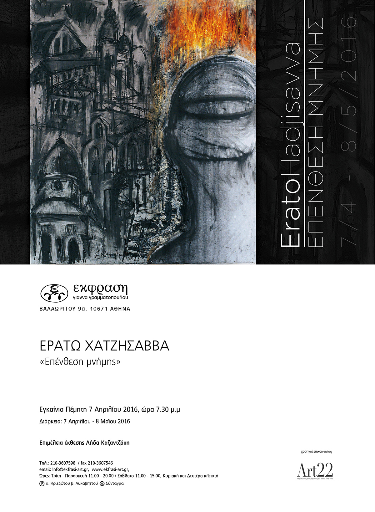 «Επένθεση Μνήμης» | Aτομική έκθεση της Ερατώς Χατζησάββα σε επιμέλεια Λήδας Καζαντζάκη | Εγκαίνια: Πεμ. 7 Απρ. 2016, στις 19:30 | Αίθουσα Τέχνης «εκφραση-γιαννα γραμματοπουλου»