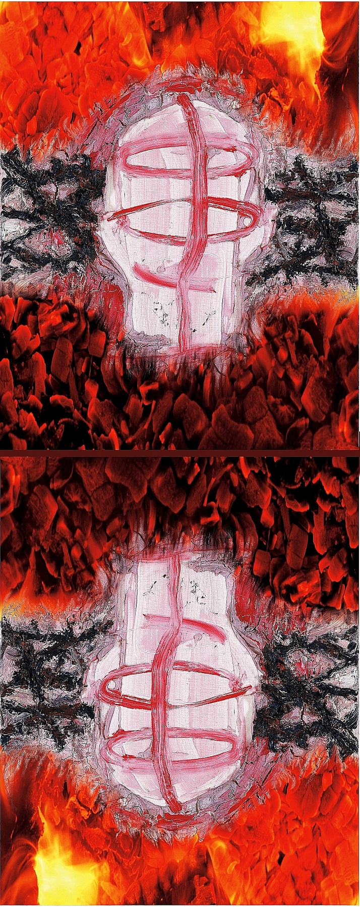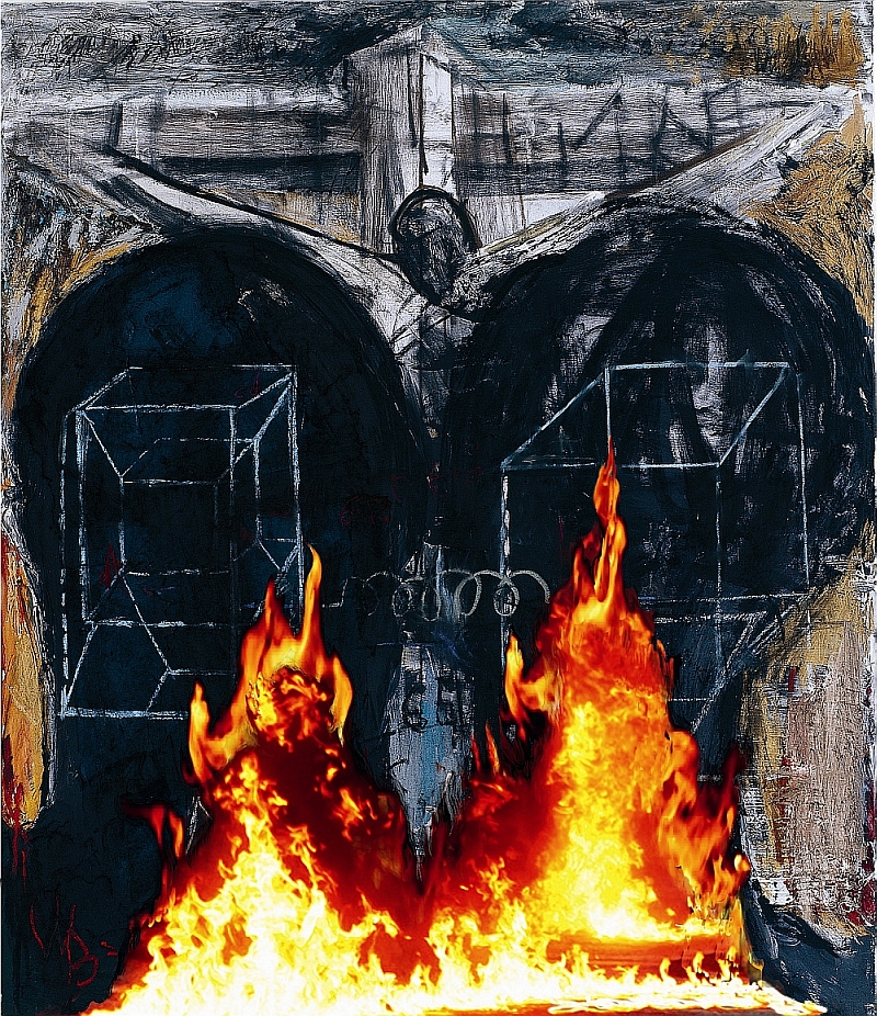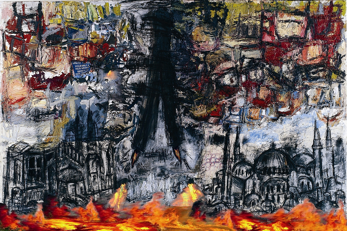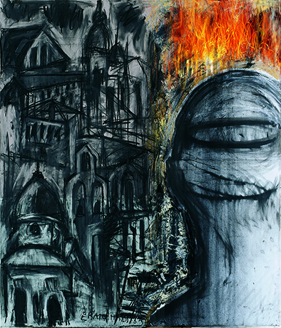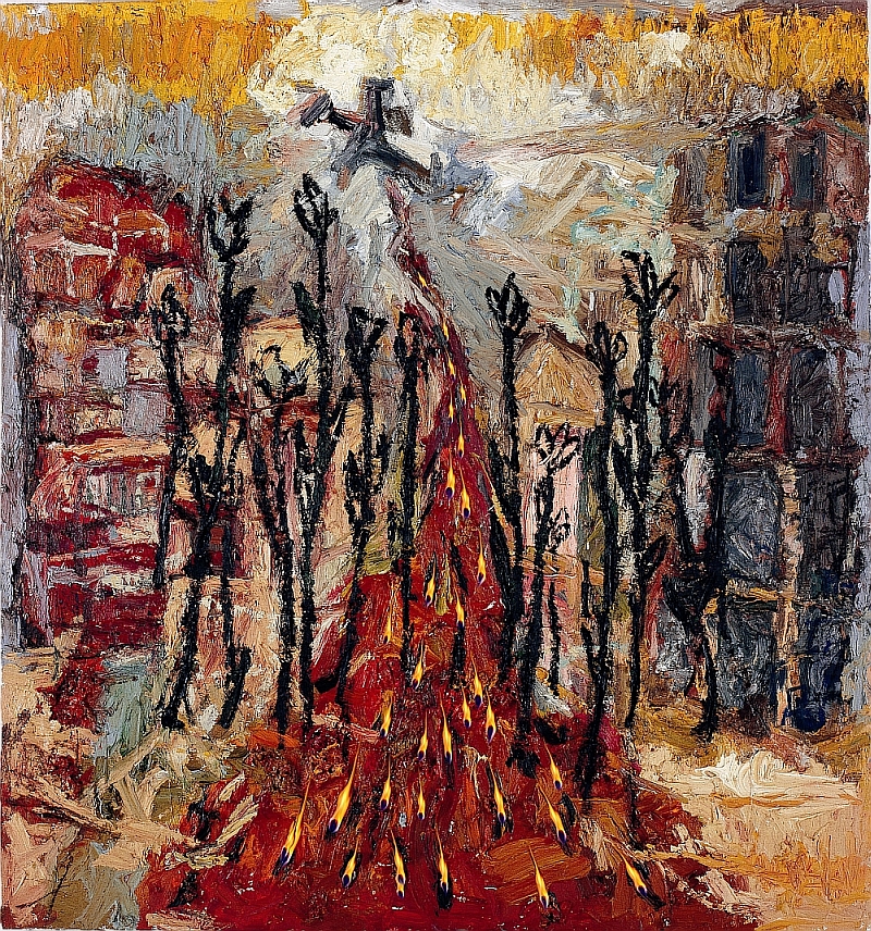 Δουλεύει μεθοδικά από μέσα προς τα έξω με διαφορετικά υλικά, πάνω σε διαφορετικά στρώματα πυκνά υφασμένες εικόνες που ανοίγουν πίσω από τη διάφανη επιφάνεια του πλέξιγκλας απρόσμενα, όπως σε μια αναλαμπή του νου ή σε μιαν έκρηξη του εξωτερικού φλοιού και αποκαλύπτουν στο θεατή τους από τα βάθη της ιστορίας τους το αδρό, φτιαγμένο με κάρβουνο, σχέδιο μιας εκκλησίας, μιας πόλης, μιας μορφής.