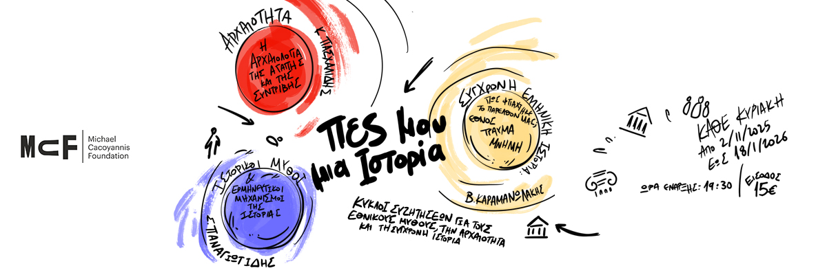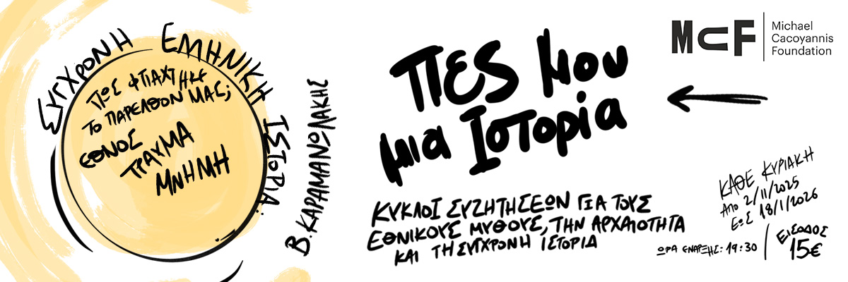 Το Ίδρυμα Μιχάλης Κακογιάννης ανοίγει δημιουργικό διάλογο με το παρελθόν παρουσιάζοντας τρεις κύκλους συζητήσεων, με τίτλο «Πες μου μια Ιστορία», που διατρέχουν την αρχαιότητα και τη σύγχρονη ελληνική ιστορία και αναδεικνύουν μύθους που έχουν καθορίσει την ελληνική ταυτότητα.