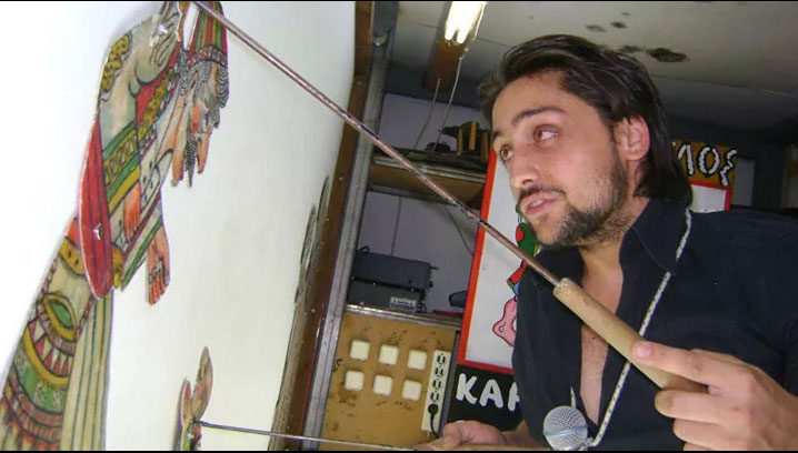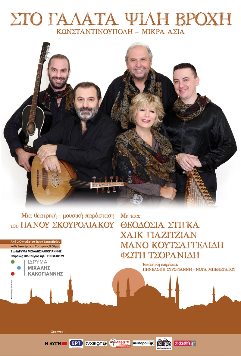 A performance which resembles a boat ride along the city waters of Smyrna, our own East, our fellow travelers in song and with musical instruments, Theodosia Stiga, Haik Giazitzian (oud), Manos Koutsaggelidis (kanun), Fotis Tsoranidis (guitar) and Panos Skouroliakos on the theatrical side, with texts from Nikiforos Romanou, Nikitas Choniatis, Miltiadis Chourmouzis, Themis Panou, and stories of everyday people. Also participating in the performance is the puppeteer, Costas Spyropoulos, bringing Karaghiozis to well-known territory, behind the mperntes!