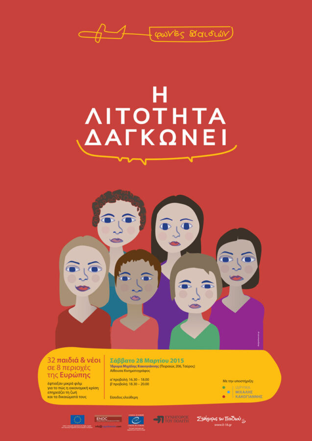 32 children and youngsters in eight European regions, narrate through short movies the way in which the economic crisis and austerity affect their lives. The films will be screened for the first time publicly on March 28, 2015, in an event organized by the Ombudsman, defined as Ombudspersons for Children, and with the support of Michael Cacoyannis Foundation.