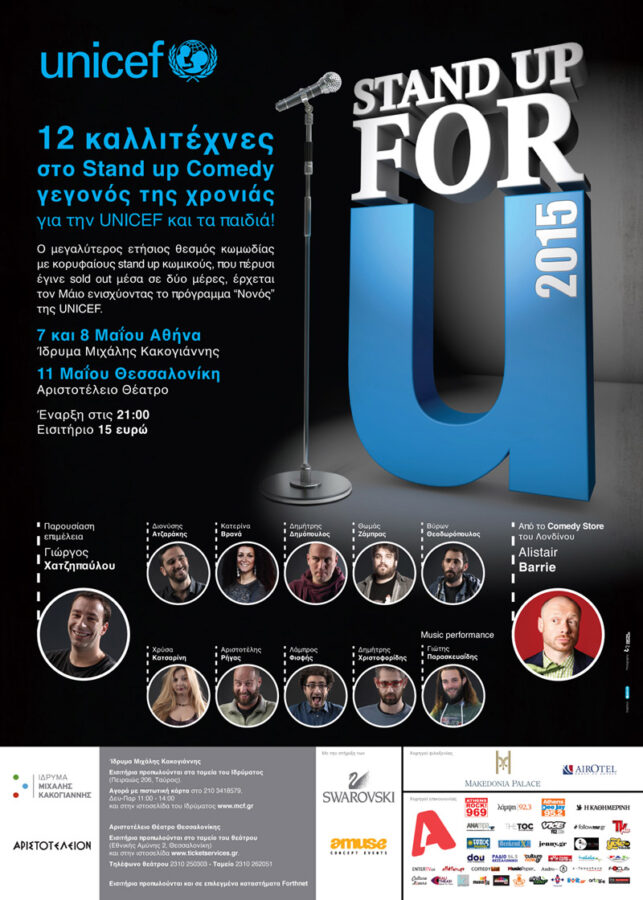 Stand up for U! 12 stand-up Comedians in three performances in Athens & Thessaloniki for UNICEF and the needs of the “Godparent for UNICEF” programme for children