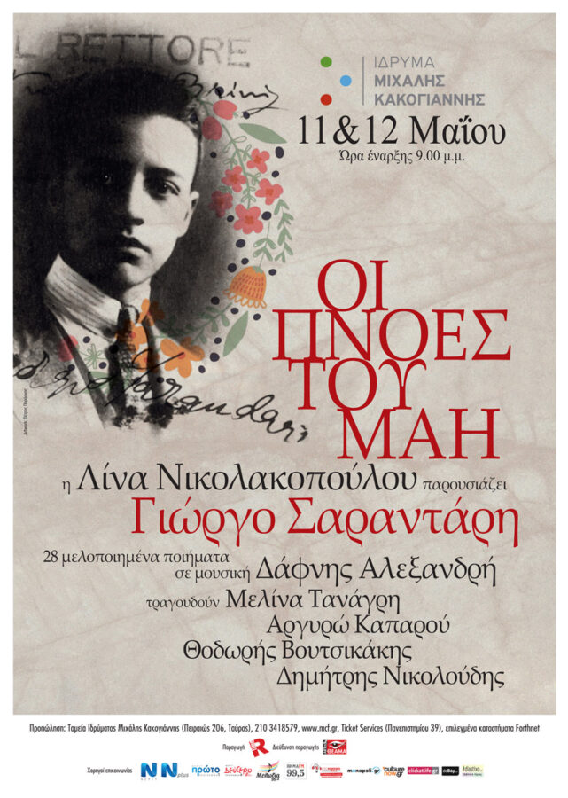 On Monday 1th and Tuesday 12th of May, Lina Nikolakopoulou will present a musical tribute to the poet of the 30s, George Sarantaris, at the Michael Cacoyannis Foundation. 28 poems will be heard, written between 1933 and 1940, set to music by Daphne Alexandri.