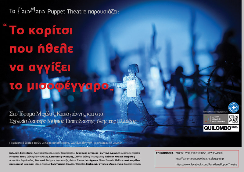 After the show, the teenage spectators are invited to share their opinion and get involved in a conversation regarding the story’s main theme as well as other relevant issues also raised by it. The discussion usually revolves around the topics of justice, democracy, freedom, solidarity and equality. Could there ever be a peaceful world? ParaMana Puppet Theatre uses three dimensional shadows of minuscule figurines that derive as projections of three dimensional images from an original handmade projector on a screen. The show is enriched with electronic music and live narration offering an unparalleled experience of shadow theatre performance.