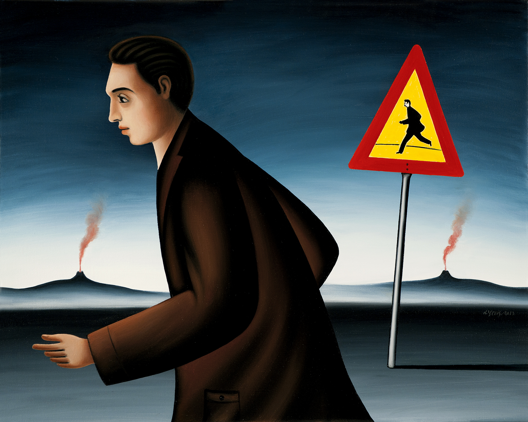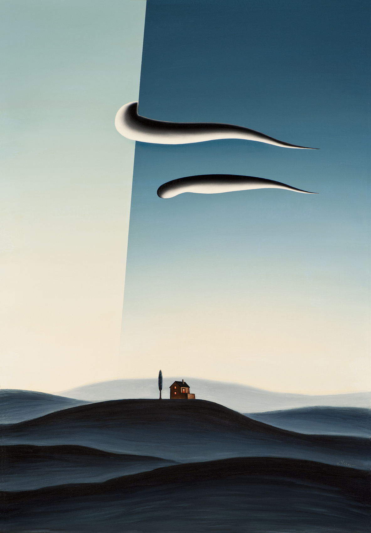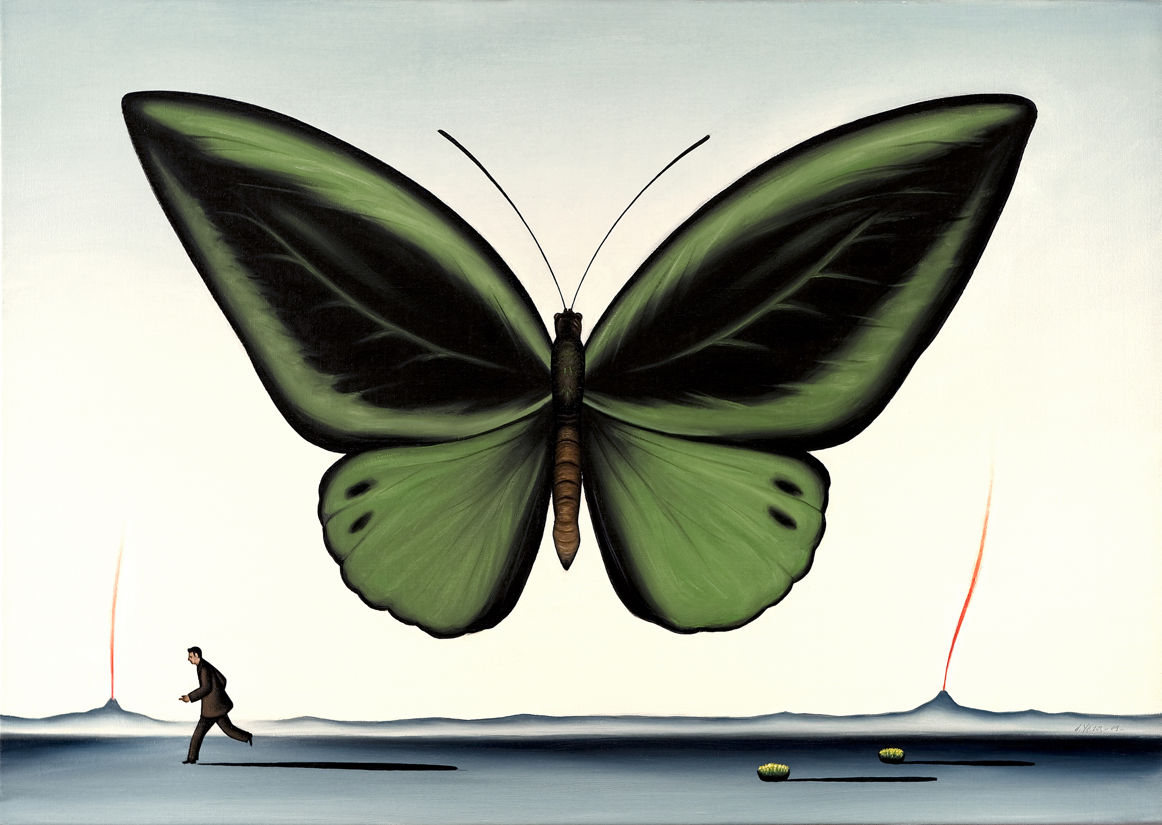 Dimitris Yeros creates a world unfettered by physical reality; instead, he remoulds the reality that he perceives, filters it and finally synthesises it into new and unexpected relationships, in a metaphysical atmosphere of an intellectual character. The intense symbolism inherent in his compositions, in the stark landscapes of indeterminate time, often with a man running across to the left, the unknown varieties of trees growing in the most unexpected places, the skies that are filled with liquid clouds, the gaps or windows that act as containers of his personal quintessence of life, have all been painted with the firm belief so firm that it becomes infectious that in fact they are naturalistic landscapes, displaying a Flemish masters meticulous care and attention to detail.