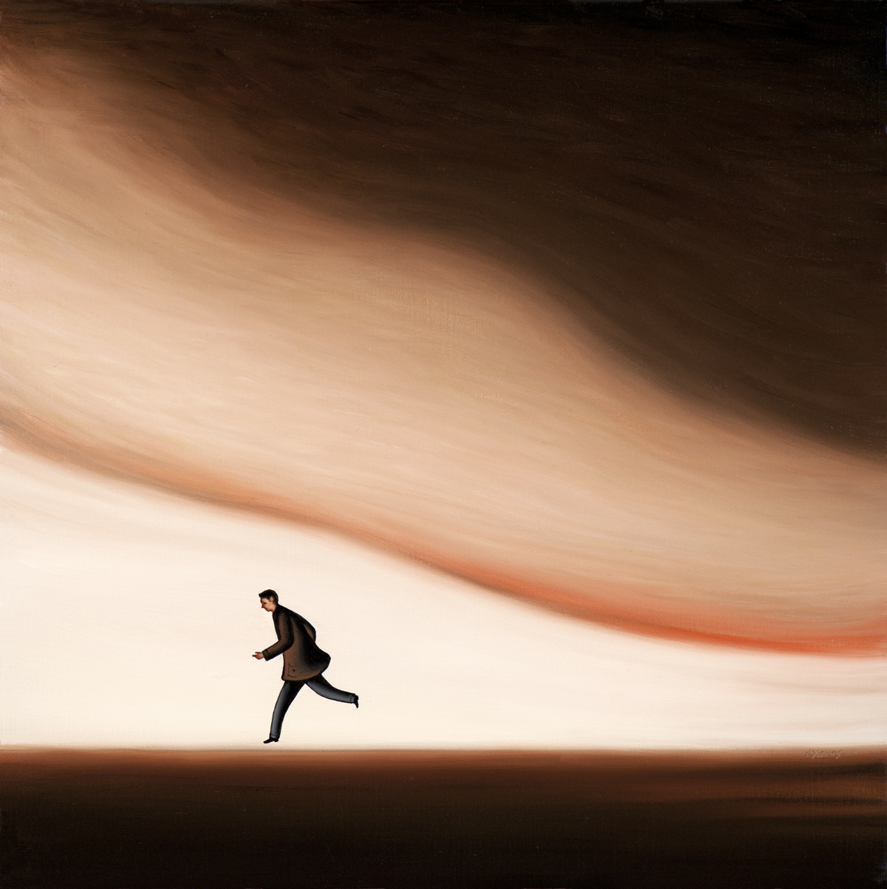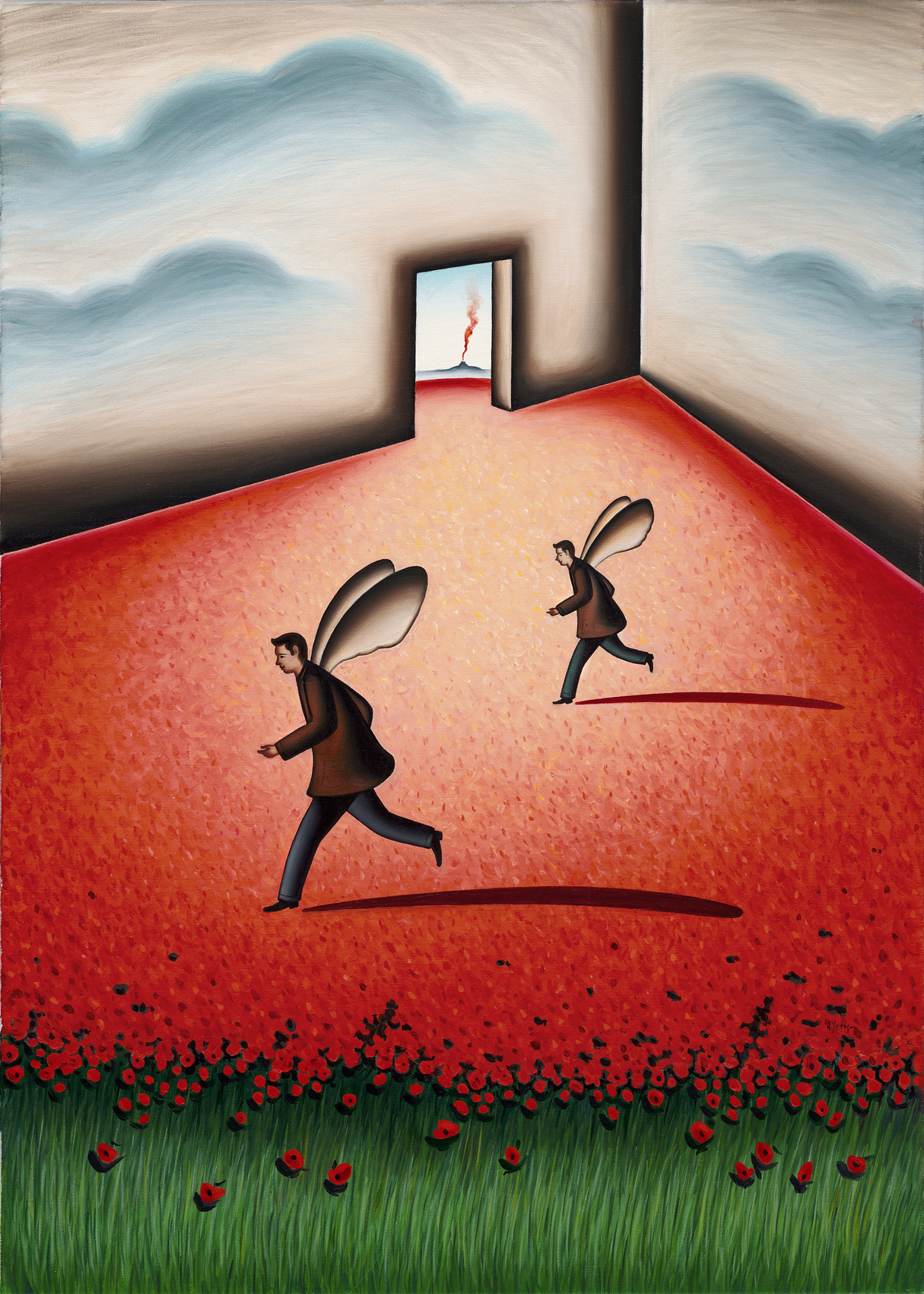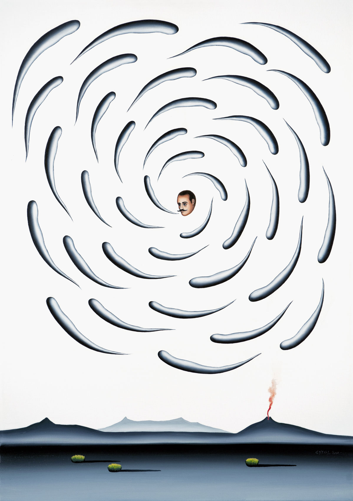 Dimitris Yeros creates a world unfettered by physical reality; instead, he remoulds the reality that he perceives, filters it and finally synthesises it into new and unexpected relationships, in a metaphysical atmosphere of an intellectual character. The intense symbolism inherent in his compositions, in the stark landscapes of indeterminate time, often with a man running across to the left, the unknown varieties of trees growing in the most unexpected places, the skies that are filled with liquid clouds, the gaps or windows that act as containers of his personal quintessence of life, have all been painted with the firm belief so firm that it becomes infectious that in fact they are naturalistic landscapes, displaying a Flemish masters meticulous care and attention to detail.