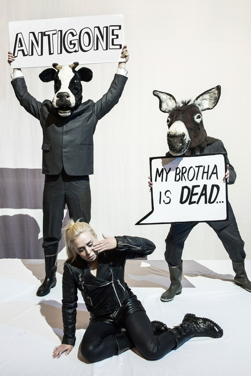 The performance handles the themes of death, excess and the Apollonian Dionysian dichotomy. It studies and combines Sophocles text and characters, pop culture imagery, music as an organic part of acting and dramaturgy and ultimately the question of personal or intimate approach to a political subject. The aim of the rehearsal process is to create a complete and uncompromising artwork through investigation and creative mutual process between different study disciplines.